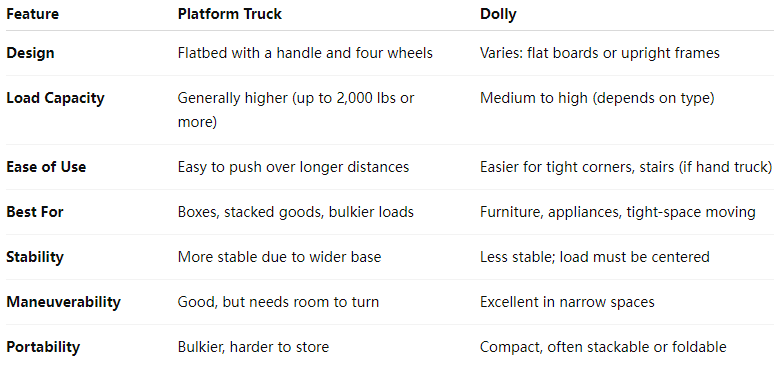 Dans les entrepôts, les magasins de détail, les services de livraison et même dans les maisons, une manutention efficace des matériaux est essentielle. Parmi les outils les plus courants pour déplacer des articles lourds ou encombrants figurent les camions de plate-forme et les coups. Bien que souvent confus en raison de leurs fonctions similaires, ces deux pièces d'équipement diffèrent considérablement dans la conception, la capacité et l'utilisation. Comprendre ces différences est crucial pour sélectionner le bon outil pour vos besoins.